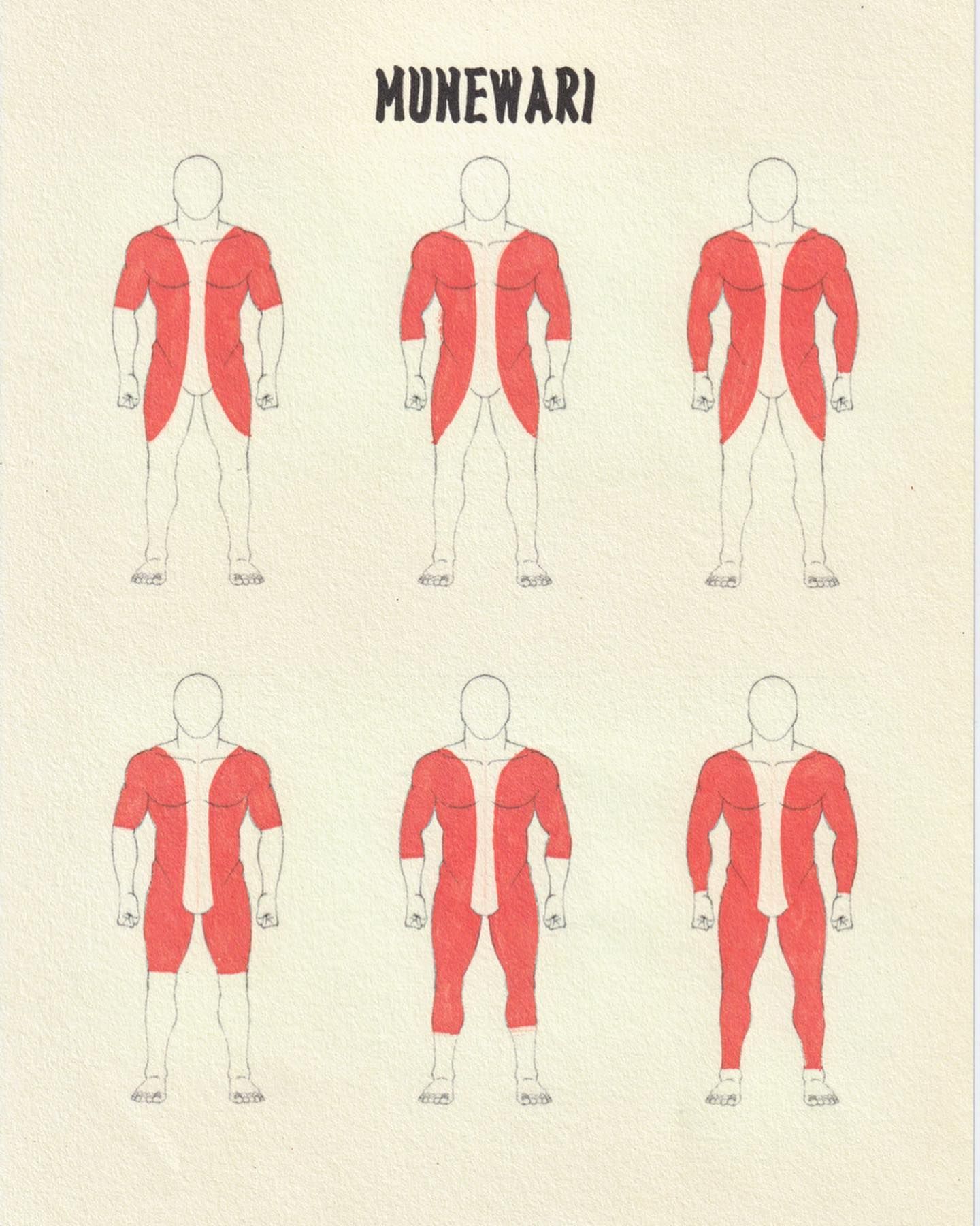 • The leg forms of Gaku in the case of Munewari can be straight down on thigh and drawn in an arc to connect with the bottom of Sewari, or it can be tattooed up to just above the knees (Han-zubon), or tattooed to under the knee(Hati-bu), or tattooed to just above the ankle (Naga-zubon).