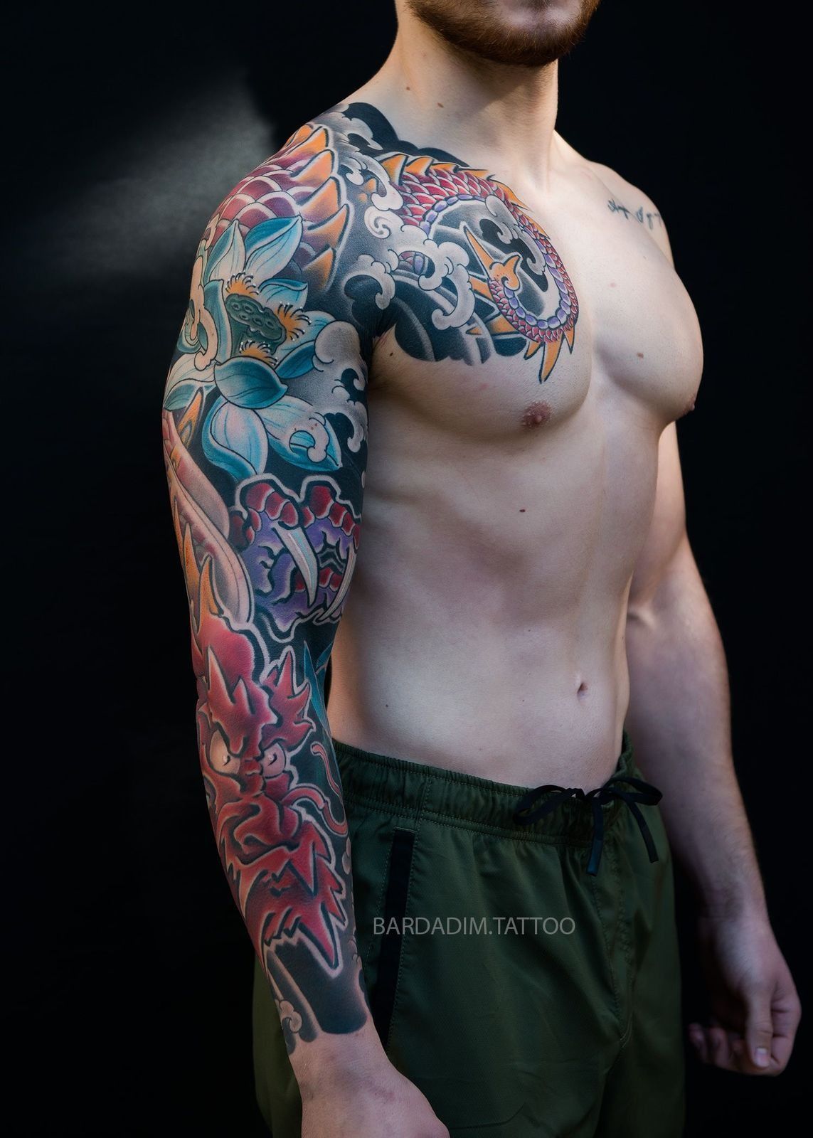 The back is the largest uninterrupted surface on the body. In traditional Irezumi, it becomes the main stage where the story unfolds. This size allows for the clear depiction of the primary motif, the shudai, supported by background elements that provide depth and flow. From here, the rest of the bodysuit grows naturally: arms, chest, sides, and legs all respond to the lines and energy set in the backpiece. Without this foundation, the full-body composition lacks unity and direction.
