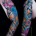 Japanese Full Sleeve Tattoos are more typical when we are talking about Full Sleeves. Every detail shown has a very deep meaning, in this case it koi, chrysanthemum and maple leafs. Here you can find some information about the meaning in Japanese tattoo: