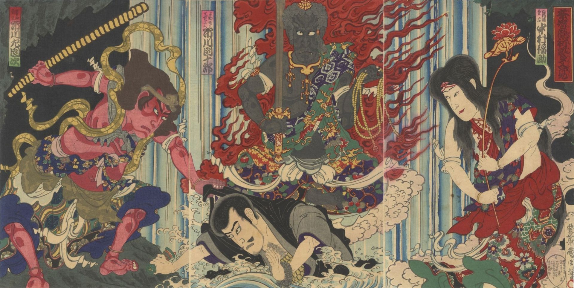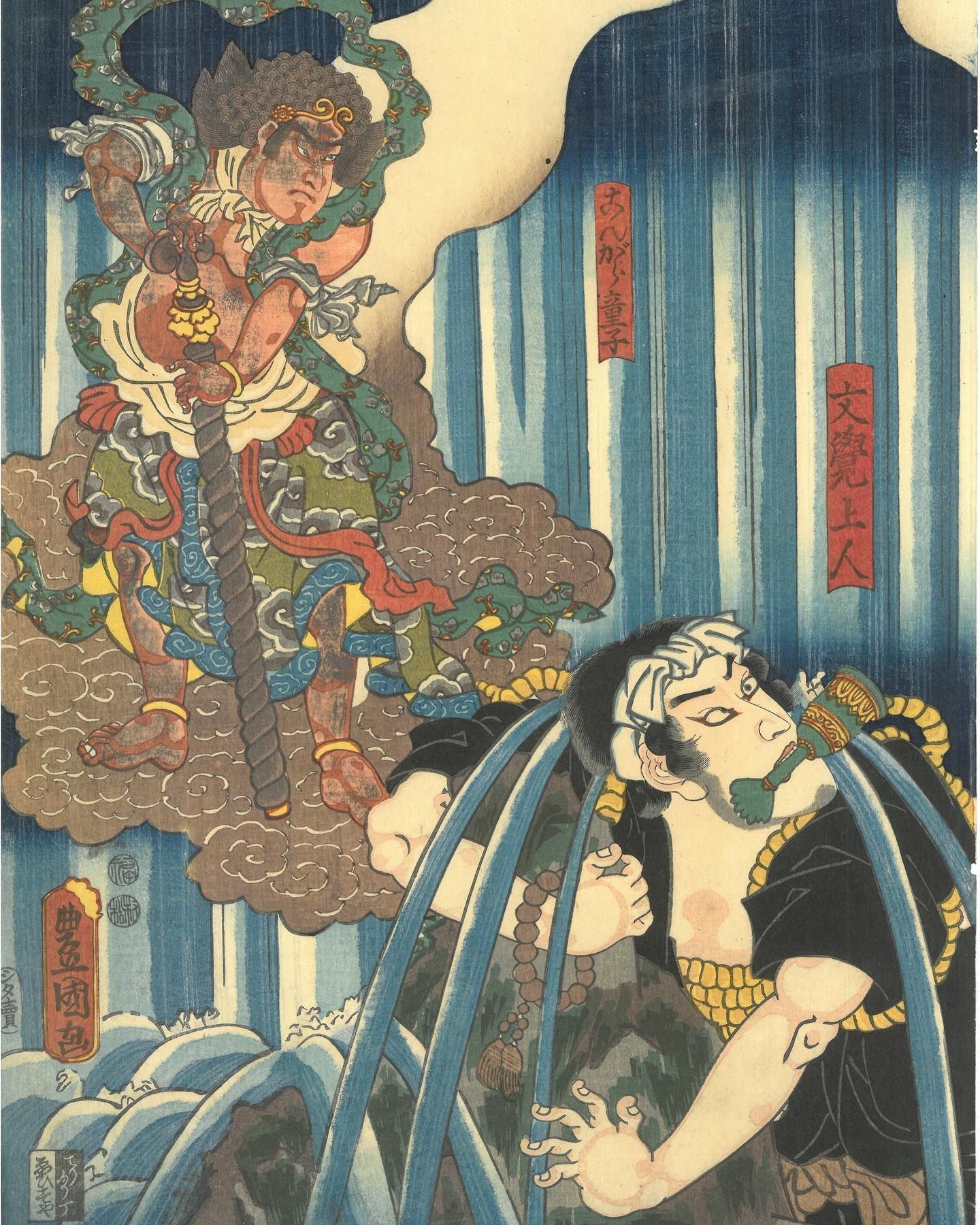 The back allows the story to unfold exactly as it should. The waterfall dominates the entire field. Mongaku sits at the center, anchored through the spine. Above him, the presence of Fudō Myōō establishes authority and restraint. Below, water and impact dissolve the body into movement.